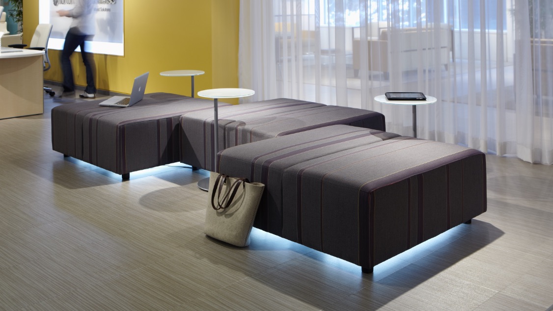 Connector tables attach to the Await Lounge System seating components with ganging plates.